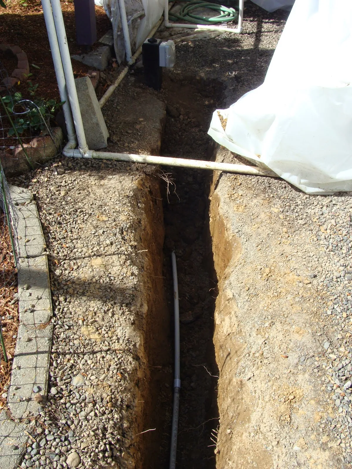 house to run electrical to the Brug House. So what we had done this time was a new line to both the new greenhouse and to the Brug House with a shut off switch so when not in use they could be shut down. Current electrical is important so we also had GIF put into to all the outlets. So with the old greenhouse gone we started digging the ditch for the new line!